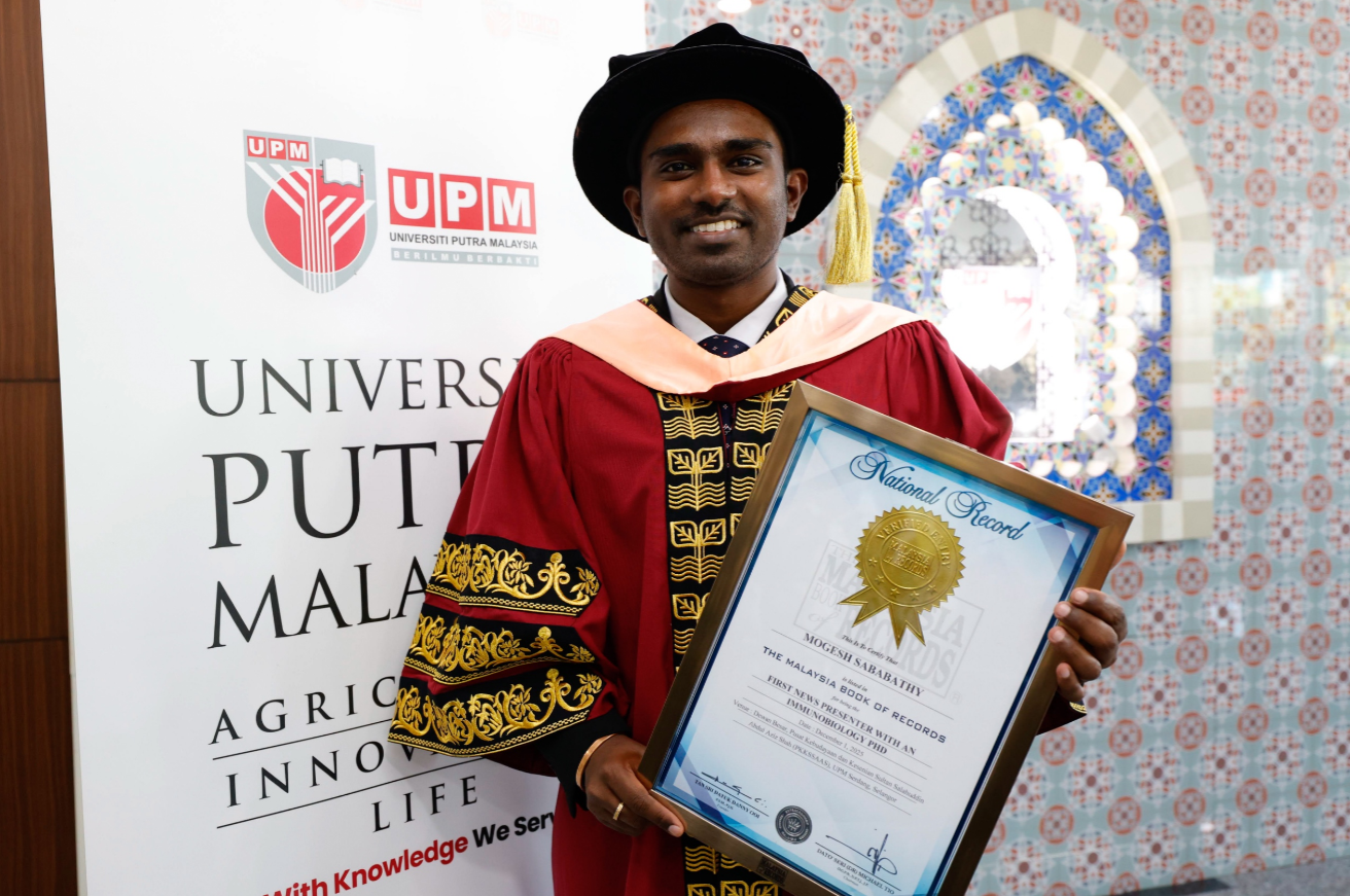 SERDANG, 2 December – Mogesh Sababathy, a newsreader with Pertubuhan Berita Nasional Malaysia (BERNAMA), made history today after graduating with a Doctor of Philosophy (PhD) in Immunobiology from Universiti Putra Malaysia (UPM), on the same day he was officially recognised by the Malaysia Book of Records as the country’s first News Presenter with a Doctorate in Immunobiology.