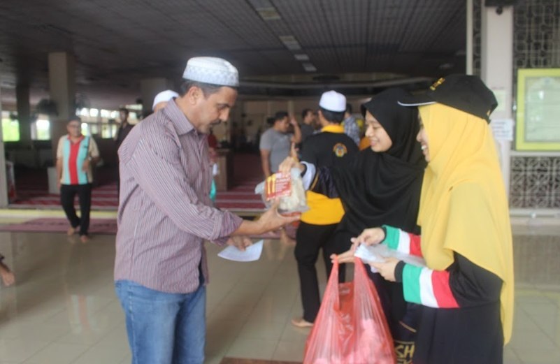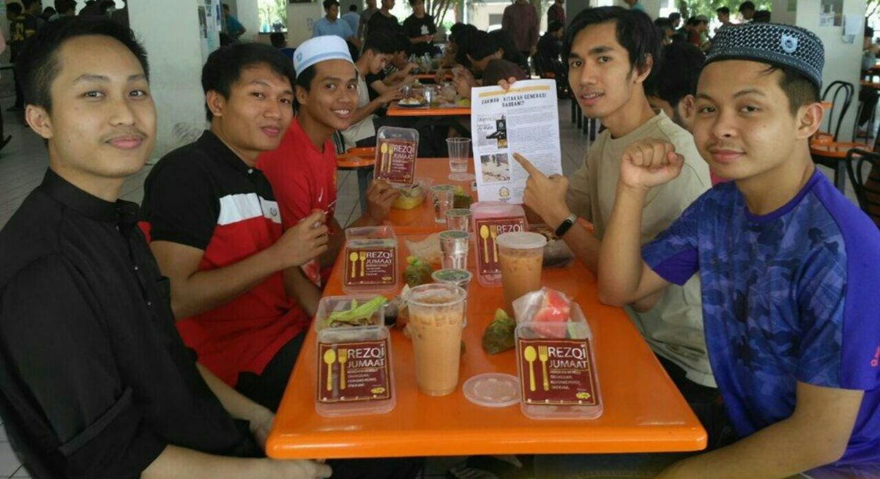 The first team distributed 100 packs of Friday Rezqi Nasi Lemak at the bus stops near the Faculty of Science and School of Business and Economics, while the second team distributed 100 packs of Friday Rezqi Steamed Rice at UPM Mosque after Friday prayers.