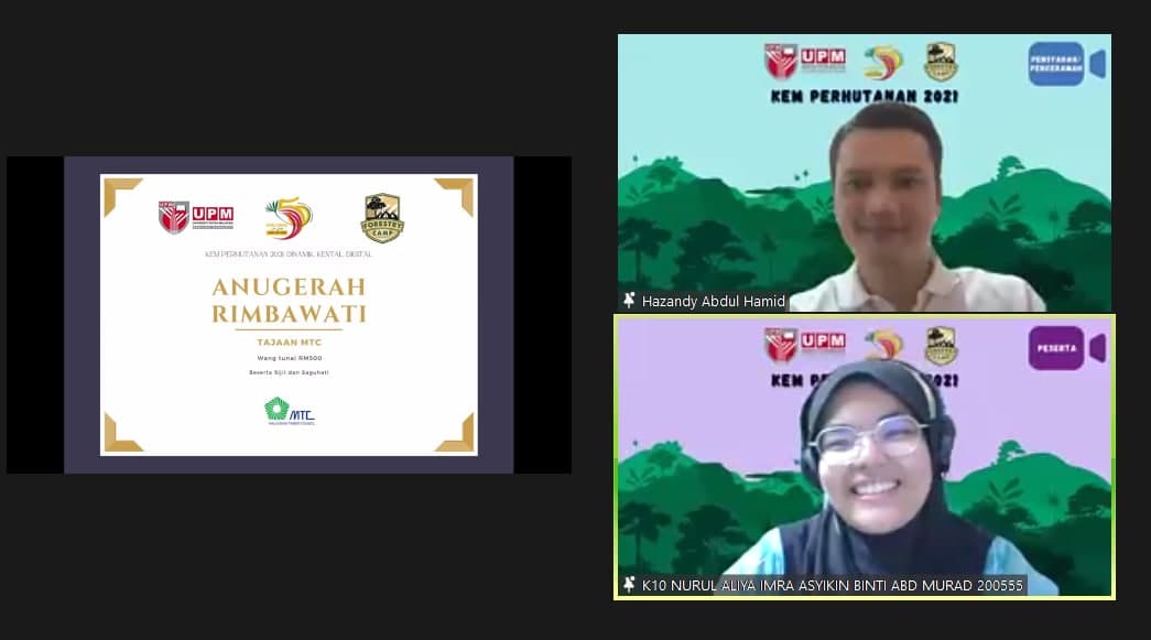 Forestry-related content was also disseminated in a webinar where speakers were from the Forestry Department of Peninsular Malaysia (JPSM), MACC, MTCC, UPM Counselling Division, UPM Teaching Hospital (HPUPM) and Forestry Camp Alumni who were previously crowned as Rimbawan and Rimbawati.