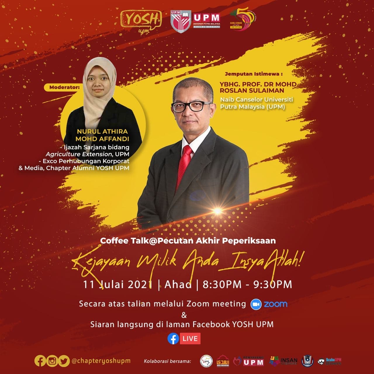 The Coffee Talk Programme: Pecutan Akhir Peperiksaan, Kejayaan Milik Anda! (The Exam Final Sprint, Success is Yours!) was a collaboration with the Gerakan Pengguna Siswa UPM, Kelab Al Huda UPM, Kelab Penyayang UPM, Scuba Club UPM, and Faculty of Educational Studies Students’ Association (FEDSSA), UPM.